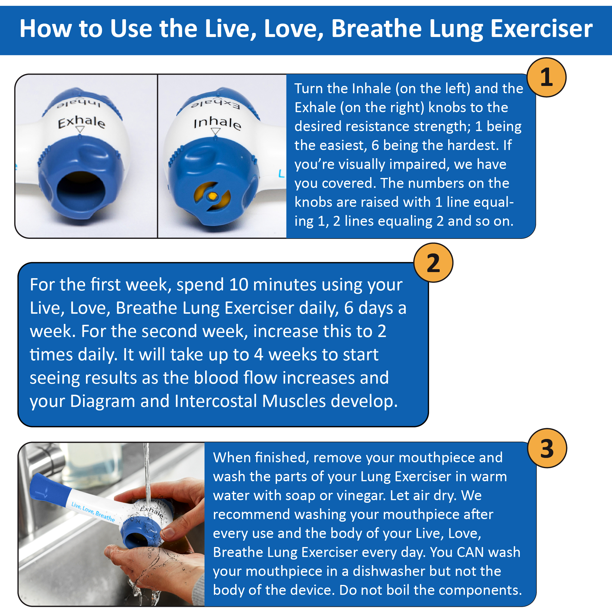 THE ONLY MADE IN THE USA RESPIRATORY MUSCLE TRAINING DEVICE PURPOSEFULLY BUILT TO STRENGTHEN INTERCOSTAL AND DIAPHRAGM MUSCLES | Live, Love, Breathe again Inhalation and Exhalation Lung Trainer uniquely offers two functions: resistance training on inhale and resistance training on exhale.  As both an inspiratory and expiratory muscle trainer; you can set either the Inhale or Exhale knobs to 5 different levels of resistance, offering exceptional and unmatched strength and conditioning that can be adjusted and increased over time.  In addition, the Live, Love, Breathe Lung Trainer includes 3 separate mouth pieces of vary size and dimensions, giving the user the option to choose which fits them best.